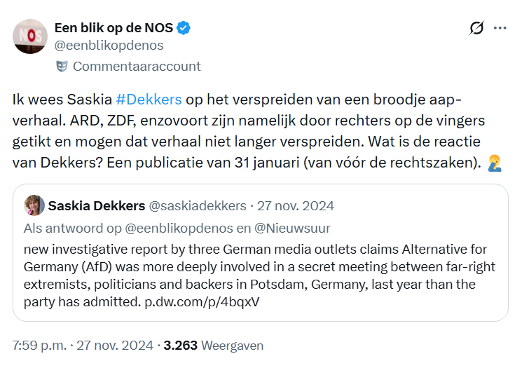 Gisteren werd de tekst van de uitspraak openbaar gemaakt en die is voor Correctiv vernietigend. Duitse media als WELT en Junge Freiheit berichten erover, maar de NOS laat het opnieuw afweten. Dat is niet verrassend, want eerder toonden verschillende NOS’ers ook al geen enkele interesse zich in het verhaal te verdiepen (en hun berichtgeving te rectificeren). Ik attendeerde niet alleen de Duitsland-correspondenten Charlotte Waaijers en Chiem Balduk op hun onjuiste berichtgeving, maar ook Europa-correspondent Saskia Dekkers (die vaak in Nieuwsuur aan het woord komt). Hieronder een veelzeggende screenshot.