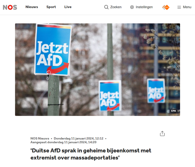 “’Duitse AfD sprak in geheime bijeenkomst met extremist over massadeportaties’”, kopte de NOS op 11 januari 2024 boven een artikel op haar website. Tijdens een besloten bijeenkomst in Potsdam zou een plan zijn besproken “om miljoenen mensen op basis van racistische criteria Duitsland uit te zetten. Of deze mensen een Duits paspoort hebben of niet maakt voor de groep niet uit.”
